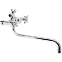 Смеситель имеет длинный поворотный излив и 2 вентиля для регулирования подачи воды. Режим «Душ» переключается поворотом рычага. Сантехника устанавливается на стену. В комплект входит душевая лейка и шланг.