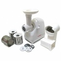 Реверс: есть • Производительность: 0.4 кг/мин • Насадки-решетки: Есть, 2 штуки • Прочие насадки: для приготовления колбас, для формовки теста • Лоток для подачи продуктов: есть, пластик • Цвет корпуса: белый • Материал корпуса: пластик • Максимальная мощность: 1500 Вт