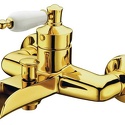 Назначение: ванна+душ • Конструкция: однорычажный • Монтаж: вертикальный • Материал: покрытие - золото • Подводка: жесткая • Монтажные отверстия: 2 отверстия • Форма излива: каскадная • Душевая лейка в комплекте: нет