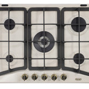 Поверхность: варочная панель • Тип поверхности: газовая • Рабочая поверхность: эмаль • Число конфорок: 5 • Установка: независимая • Газовые конфорки: всего - 5 (1 конфорка "Тройная корона") • Газ-контроль конфорок: есть • Тип управления: механическое • Переключатели: поворотные • Электроподжиг: есть, автоматический • Размеры: 680x500x80 мм • Размер ниши для встраивания: 553x473 мм • Цвет: панель - бежевый