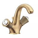 Назначение: для умывальника • Конструкция: двухрычажный • Монтаж: горизонтальный • Материал: латунь, покрытие - бронза • Подводка: гибкая • Монтажные отверстия: 1 отверстие • Форма излива: традиционная • Душевая лейка в комплекте: нет • Аэратор: есть • Донный клапан в комплекте: есть