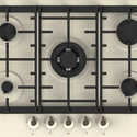 Поверхность: варочная панель • Тип поверхности: газовая • Рабочая поверхность: эмаль • Число конфорок: 5 • Установка: независимая • Газовые конфорки: всего - 5 (1 конфорка "Тройная корона") • Газ-контроль конфорок: есть • Защитное отключение: есть • Тип управления: механическое • Переключатели: поворотные • Электроподжиг: есть, автоматический • Размеры: 750x510x103 мм • Размер ниши для встраивания: 720x480 мм