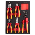Комплектация– Пассатижи комбинированные диэлектрические, 185 мм (6116-07A)– Бокорезы диэлектрические, 167 мм (6216-06A)– Пассатижи тонконосые, загнутые, диэлектрические 200 мм (6336-08A)– Пассатижи тонконосые диэлектрические, 210 мм (6318-08A)– Захват переставной, диэлектрический, 250 мм (6516-10A)