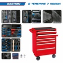 КомплектацияМодуль 1Набор отверток, съемник клипс и гибкий магнит, 19 предметов 9-31919MRМодуль 2Набор торцевых головок 1/2" с принадлежностями, 33 предмета 9-4333MR03Набор торцевых головок 3/8" с принадлежностями, 23 предмета 9-3523MRМодуль 3Набор ударных головок 1/2" и торцевых головок 1/4" с принадлежностями, 40 предметов 9-7540MRНабор торцевых насадок, шестигранники Г-образные и разрезные ключи, 31 предметов 9-90131MRМодуль 4Набор накидных ключей, 11 предметов 9-1711MRНабор комбинированных ключей, 16 предметов 9-1216MR03Модуль 5Набор переставные клещи, разводной ключ и молоток, 3 предмета 9-90103PP02Набор съемников стопорных колец, пассатижей и бокорезов, 7 предметов 9-40207GPМодуль 6Набор отвертка ударная 5/16" с принадлежностями, 6 предметов 9-4128FRВспомогательный инструментНабор выколоток, бородков, кернеров, 10 предметов 1010PRСъемник подшипников 2-х захватный 100 мм 7962-04Съемник подшипников 3-х захватный 100 мм 7963-04Тележка инструментальная: 7 выдвижных полок, цвет красный 87434-7B