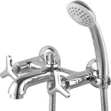 Назначение: ванна+душ • Конструкция: двухрычажный • Монтаж: вертикальный • Клапан: керамический • Материал: покрытие - хром • Подводка: жесткая • Монтажные отверстия: 2 отверстия • Форма излива: традиционная • Душевая лейка в комплекте: есть • Держатель для душевой лейки: на смесителе • Аэратор: есть • Эксцентрики в комплекте: есть • Донный клапан в комплекте: есть