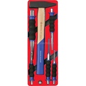 Комплектация• Молоток с деревянной ручкой 500 г.• Зубила. Размеры: 10х140, 24х220 мм.• Выколотки. Размеры: 3х150, 5х200 мм.• Кернер 4х185 мм.