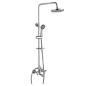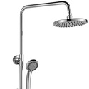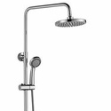 Устройство: душевая система • Смеситель: двухвентильный • Ручной душ (душевая лейка): размер 85 мм, настройки 5 шт • Верхний душ (тропический): размер 200 мм, настройки 1 шт • Комплектация: ручной душ, верхний душ, смеситель, стойка, шланг, крепление ручного душа, мыльница