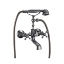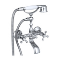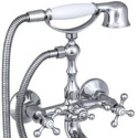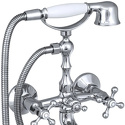 Смеситель для ванной. Душевая лейка изготовлена из металла и пластика. Душевой резиновый шланг имеет оплётку из нержавеющей стали. Покрытие шланга: двухслойный никель. Материал изделия – латунь марки ЛС59-1. Покрытие изделия – никель-хромовое. Ручки цинковые. Цвет изделия: хром. Излив: литой.