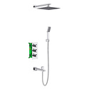 Устройство: душевая система • Смеситель: термостатический • Ручная лейка: настройки 1 шт • Верхний душ: размер 250 мм, настройки 1 шт • Комплектация: ручной душ, смеситель, шланг, крепление ручного душа